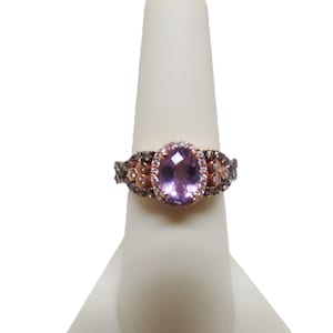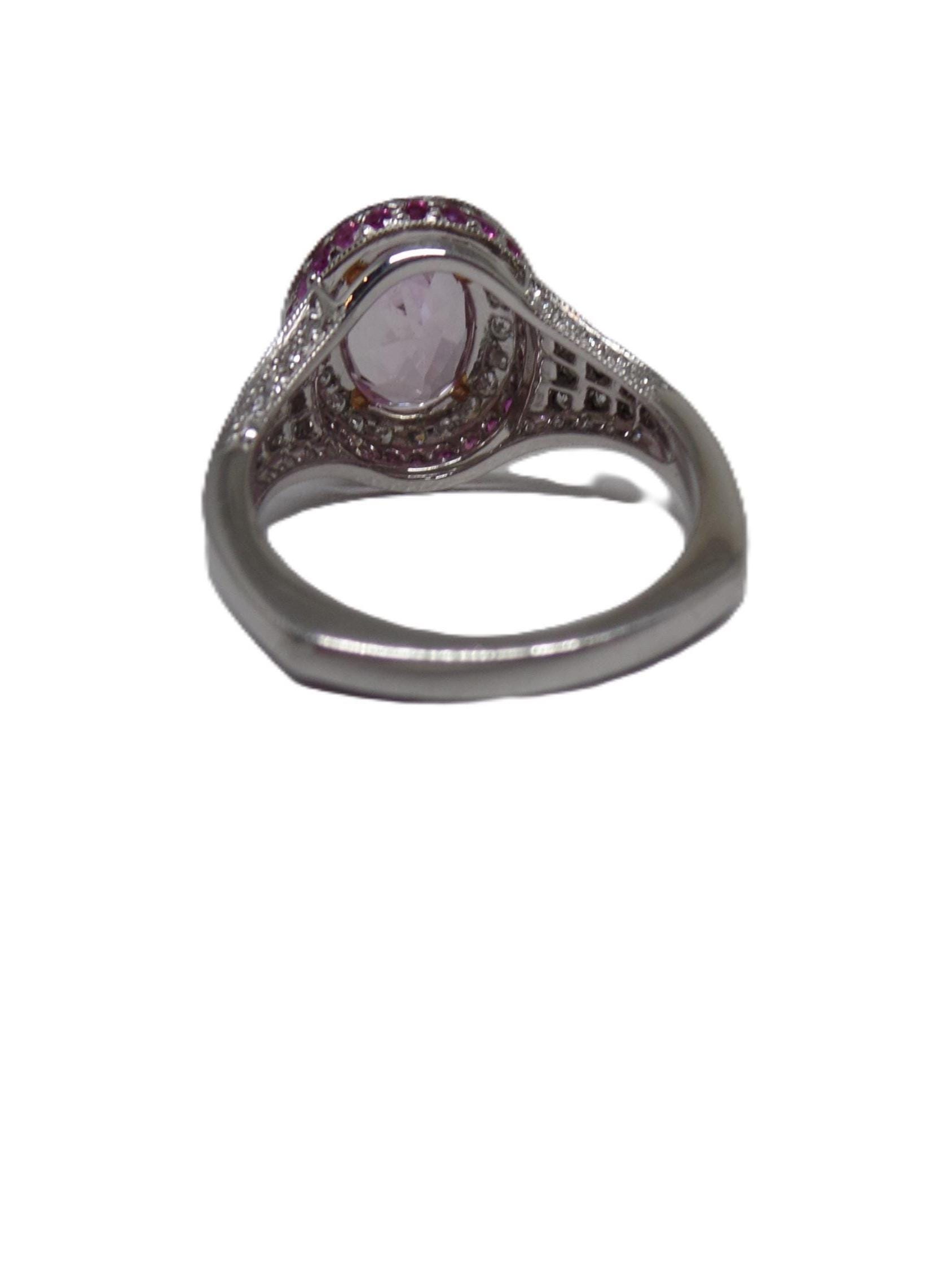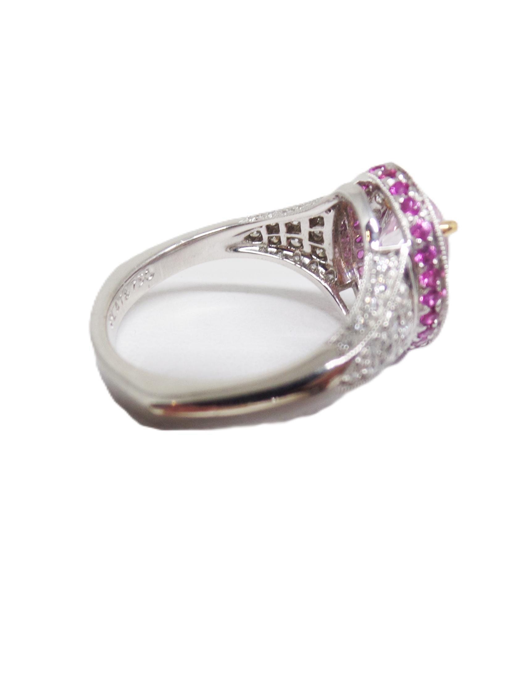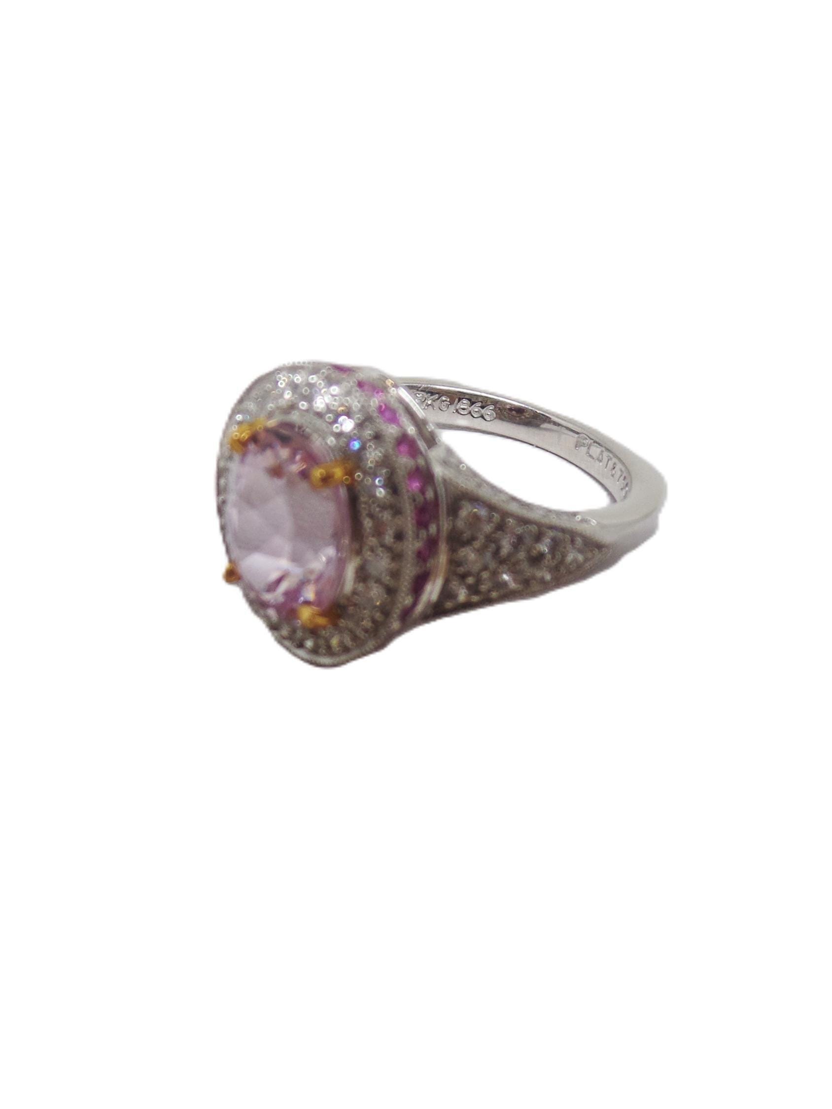 This Richard Krementz Gemstones ring features a stunning pink Kunzite stone surrounded by diamonds, set in a platinum and 18k gold band. The ring is signed by the designer and is a size 7. It has never been worn and is an original piece from the United States. Circa 2000. This fine piece of vintage and antique jewelry is a unique addition to any collection. It is perfect for those who appreciate high-quality craftsmanship and attention to detail. The ring's pink color scheme is both elegant and eye-catching, making it a great statement piece for any occasion.