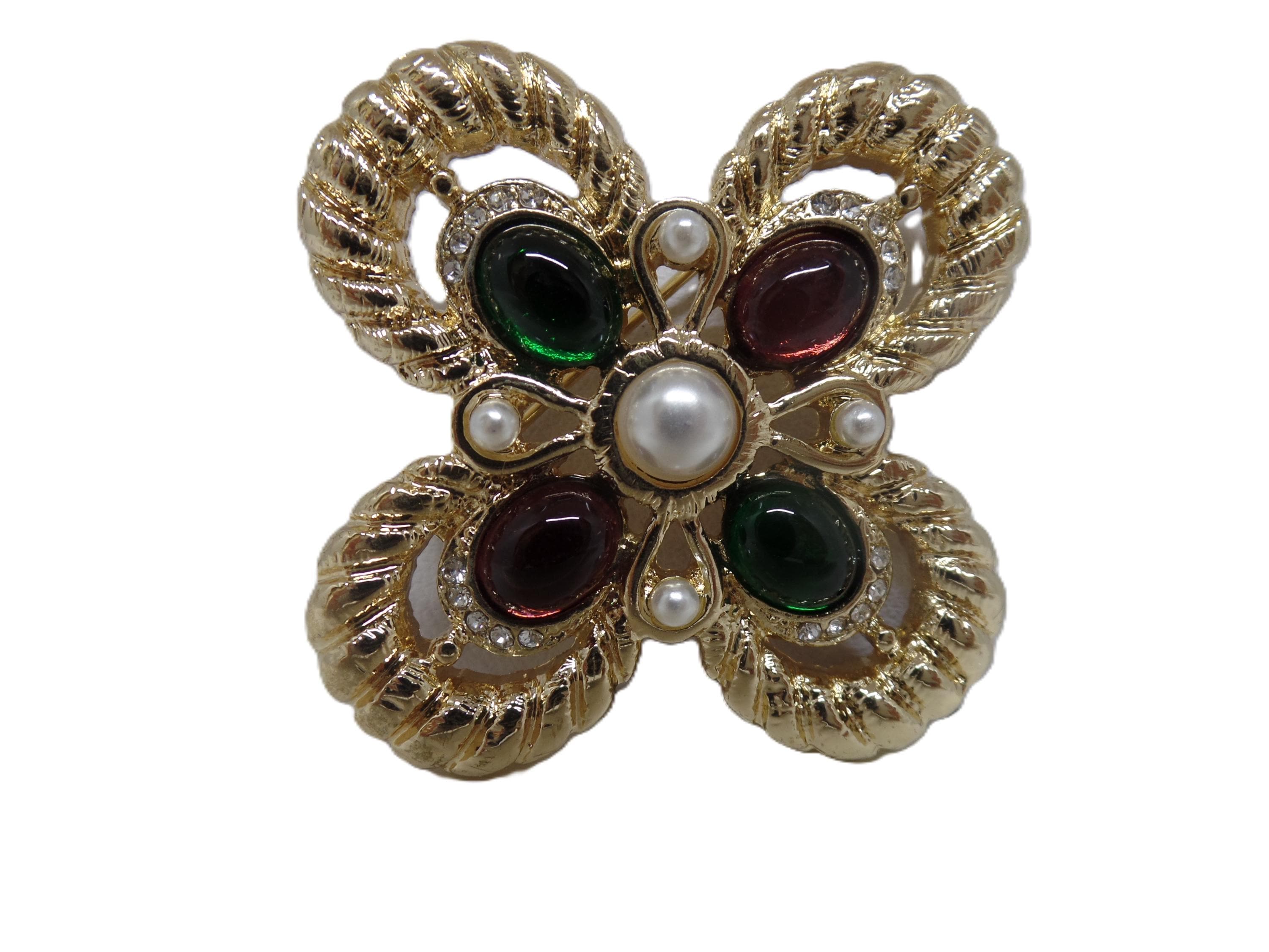Green Cabochon and Pearl Maltese Cross Mogul Style Brooch Pin