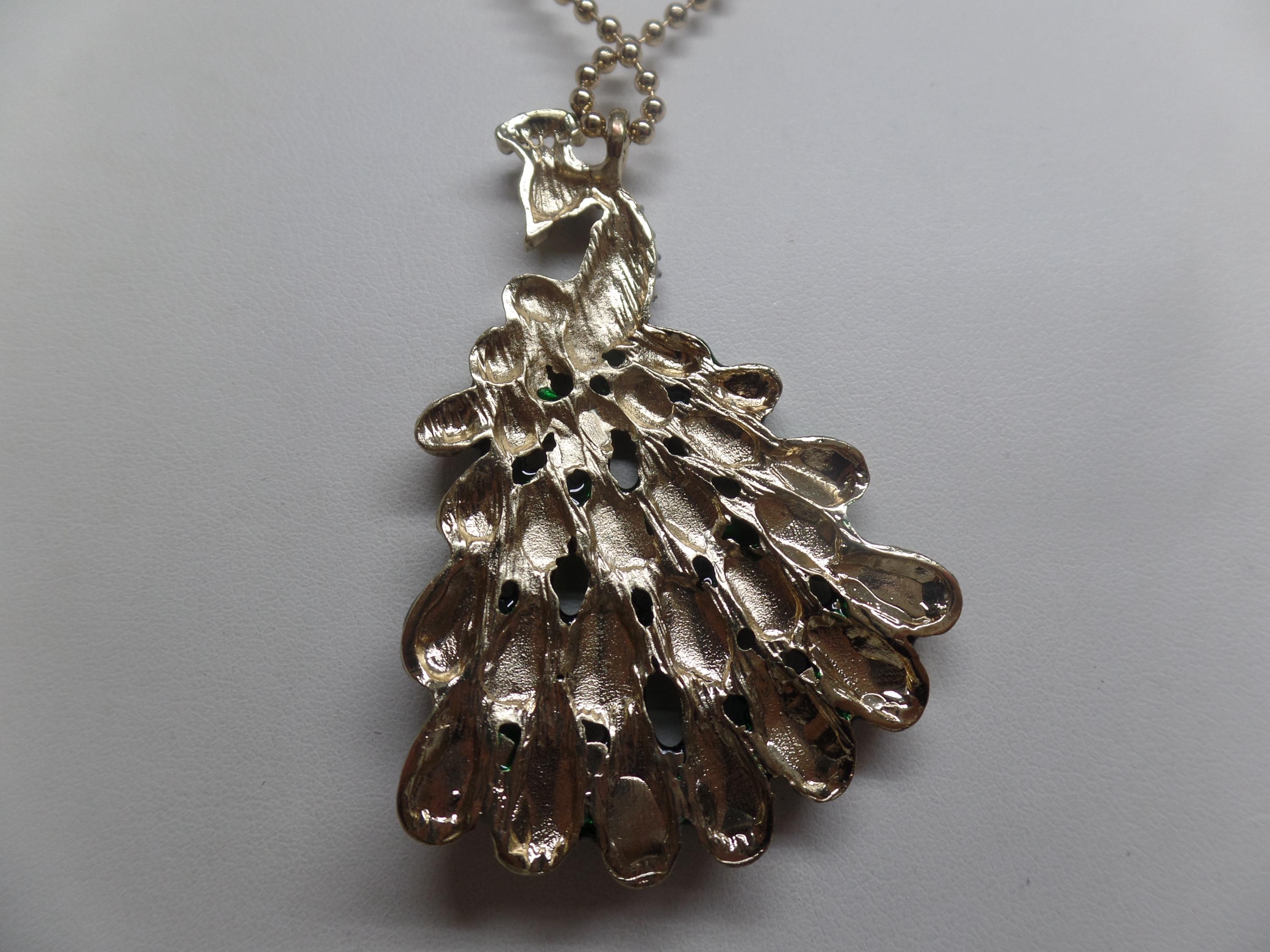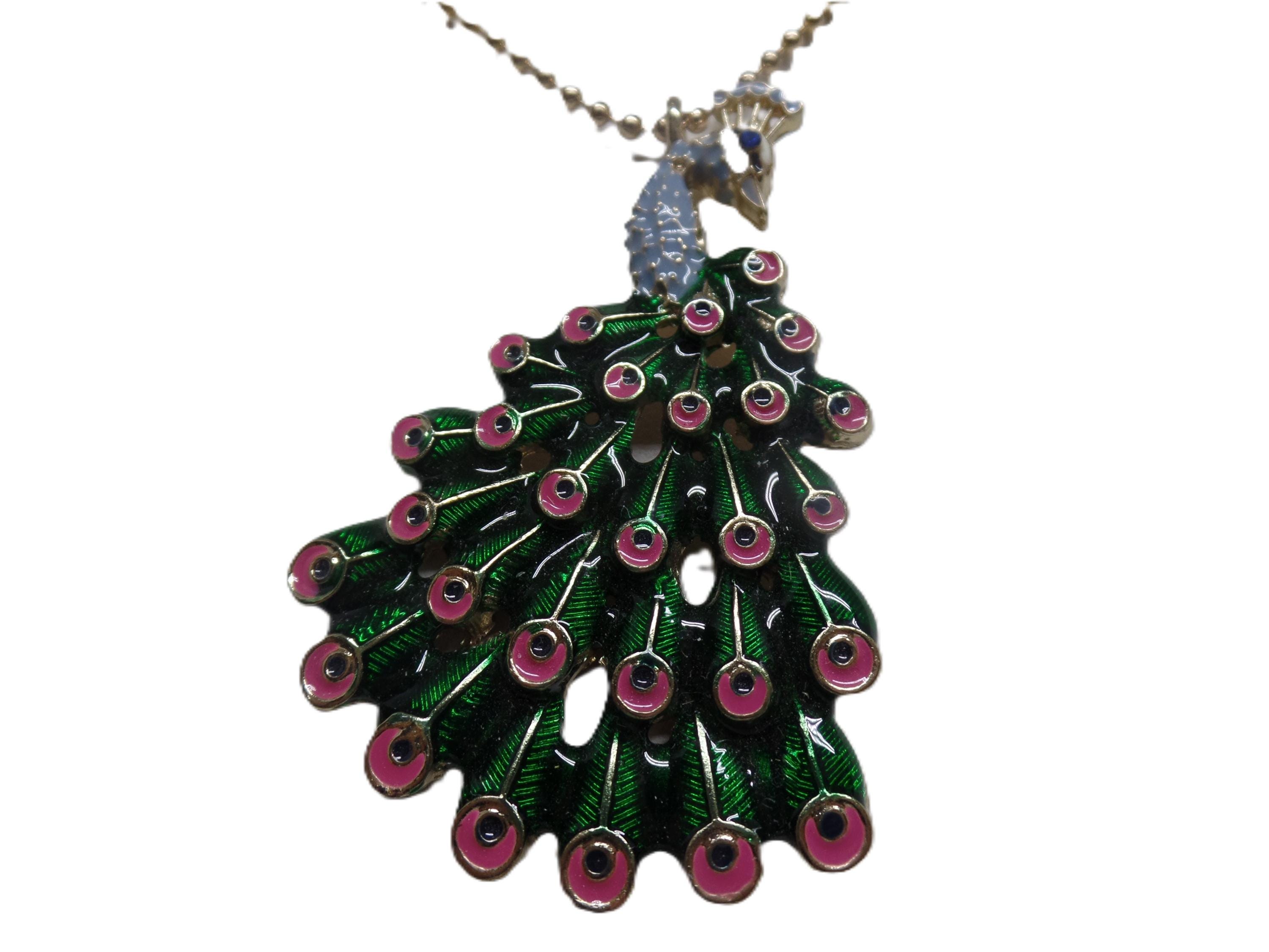 Fabulous enamel peacock necklace! Chain is 28" Long. Pendant is 2" Long.