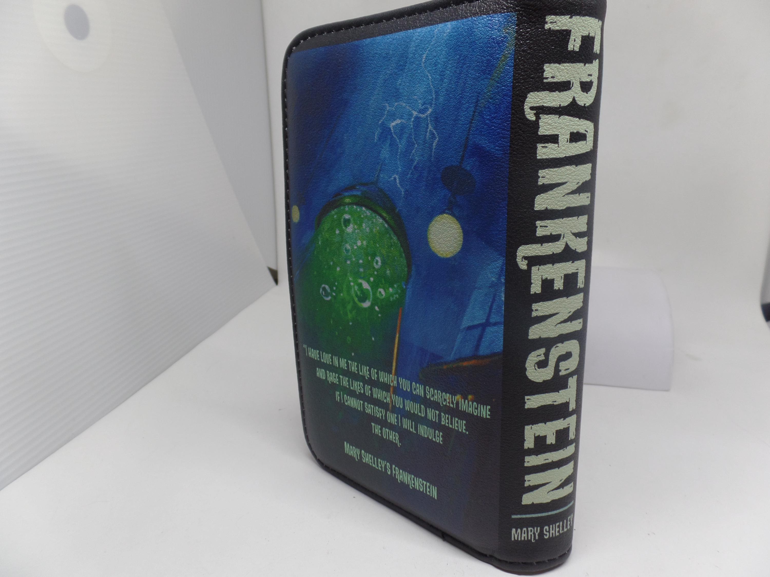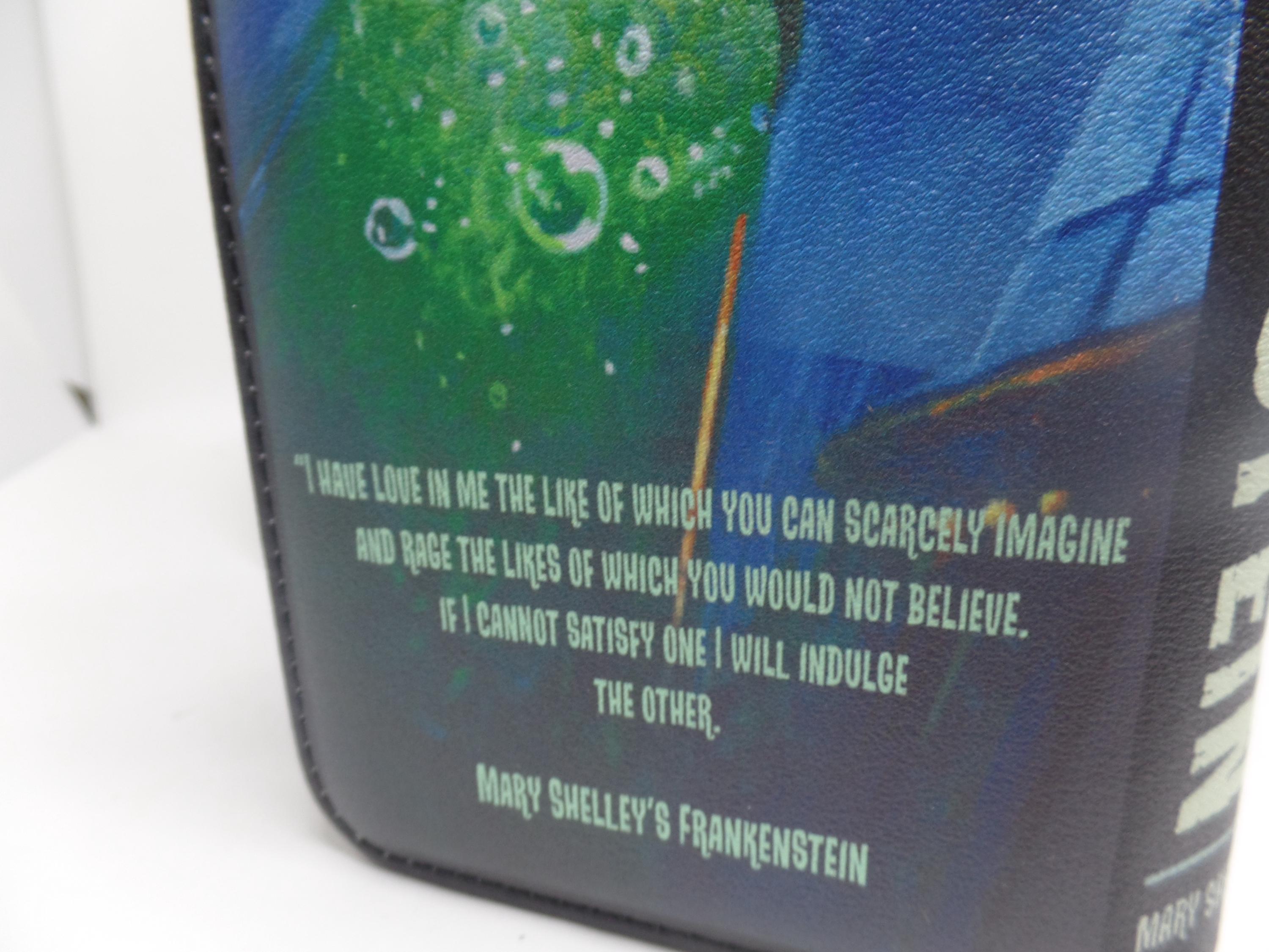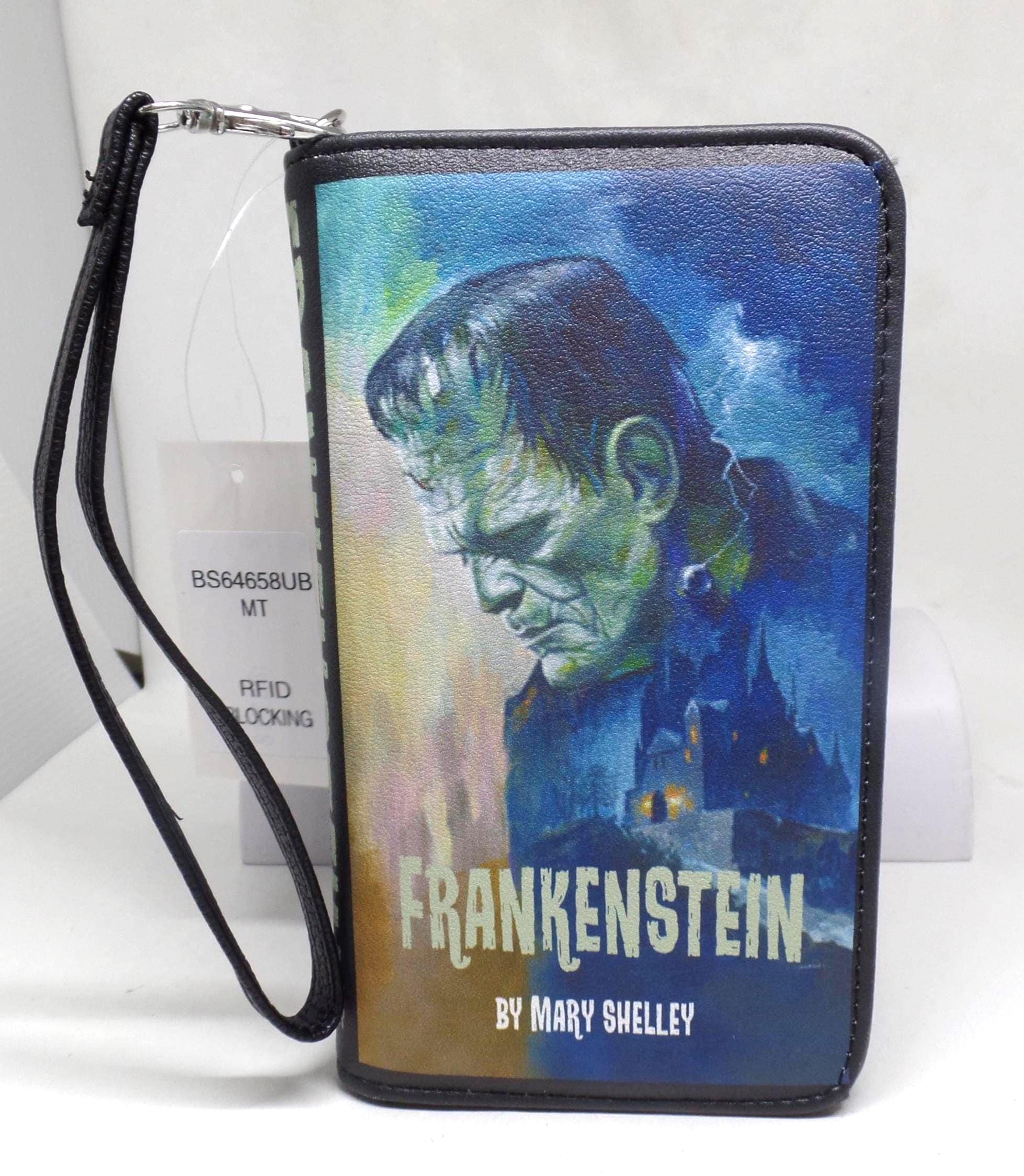This Frankenstein book wallet wristlet is a unique and stylish accessory for women. Made of faux leather and vinyl, this black wallet features a novelty pattern with a Frankenstein theme. It includes credit card slots and is designed as a wristlet for easy carrying. Perfect for fans of literature and those looking to add a touch of novelty to their accessories. RFID Secure. Includes Our Adorable Bride of Frankenstein Acrylic Brooch! Great Gift!