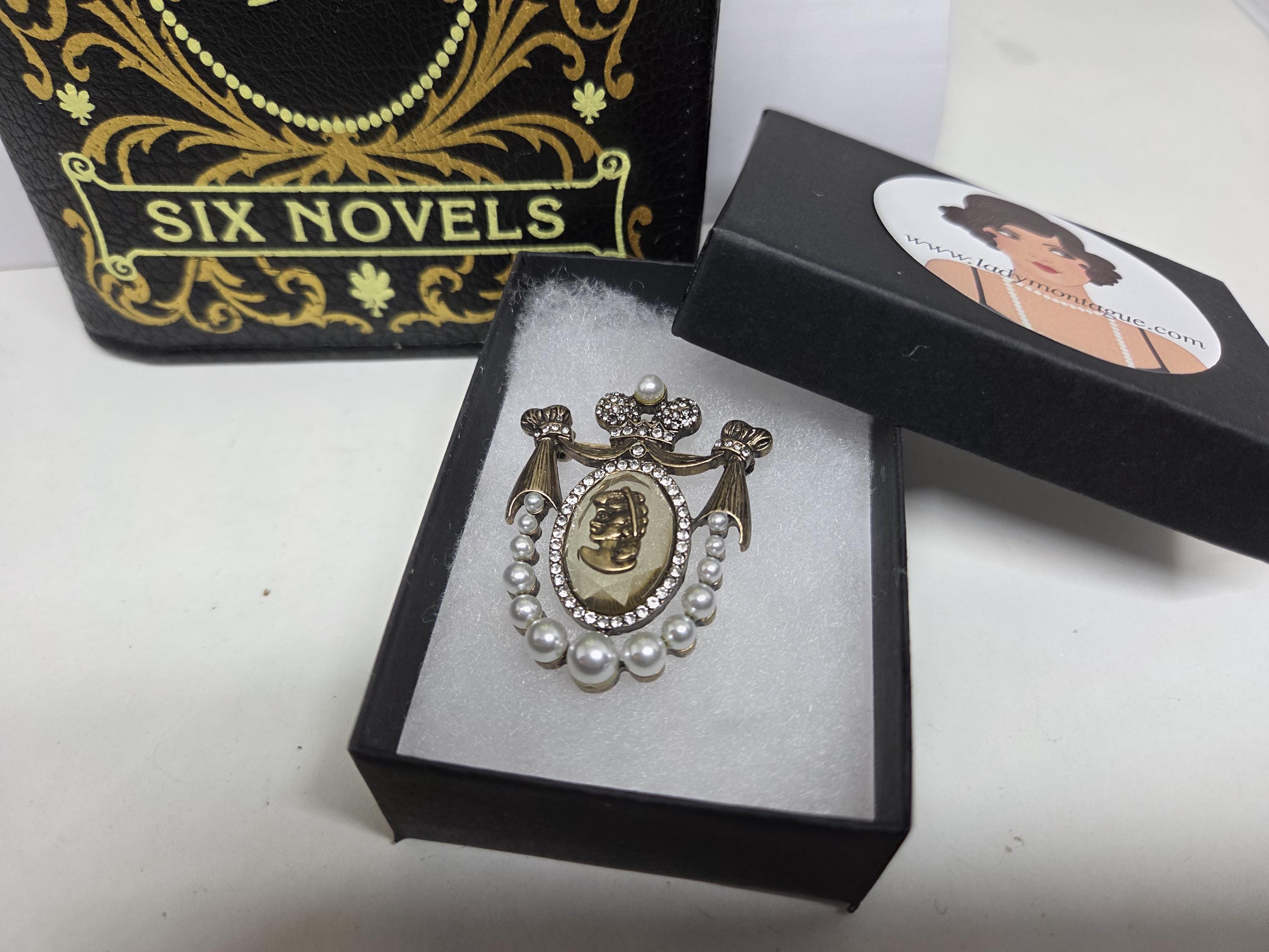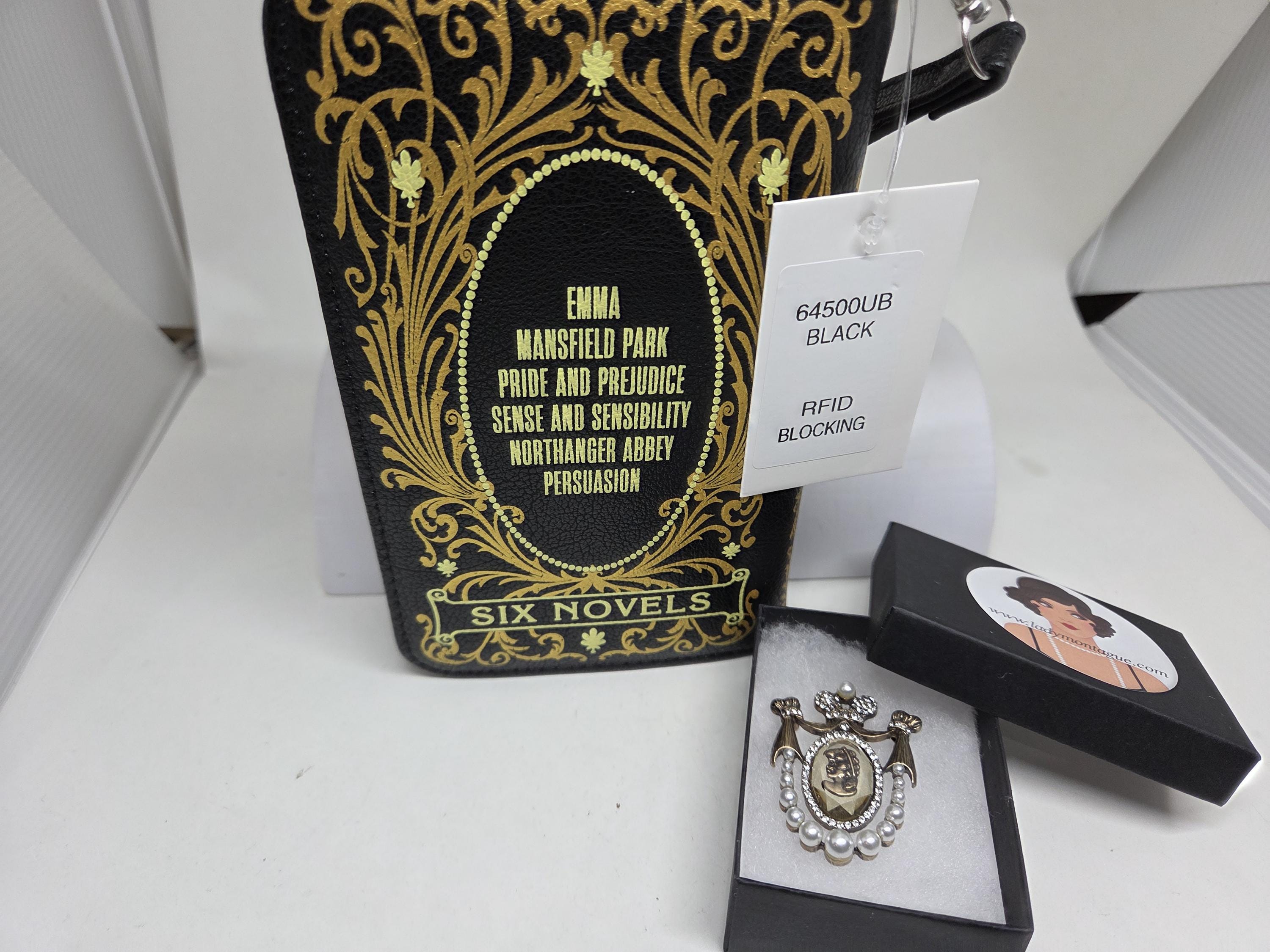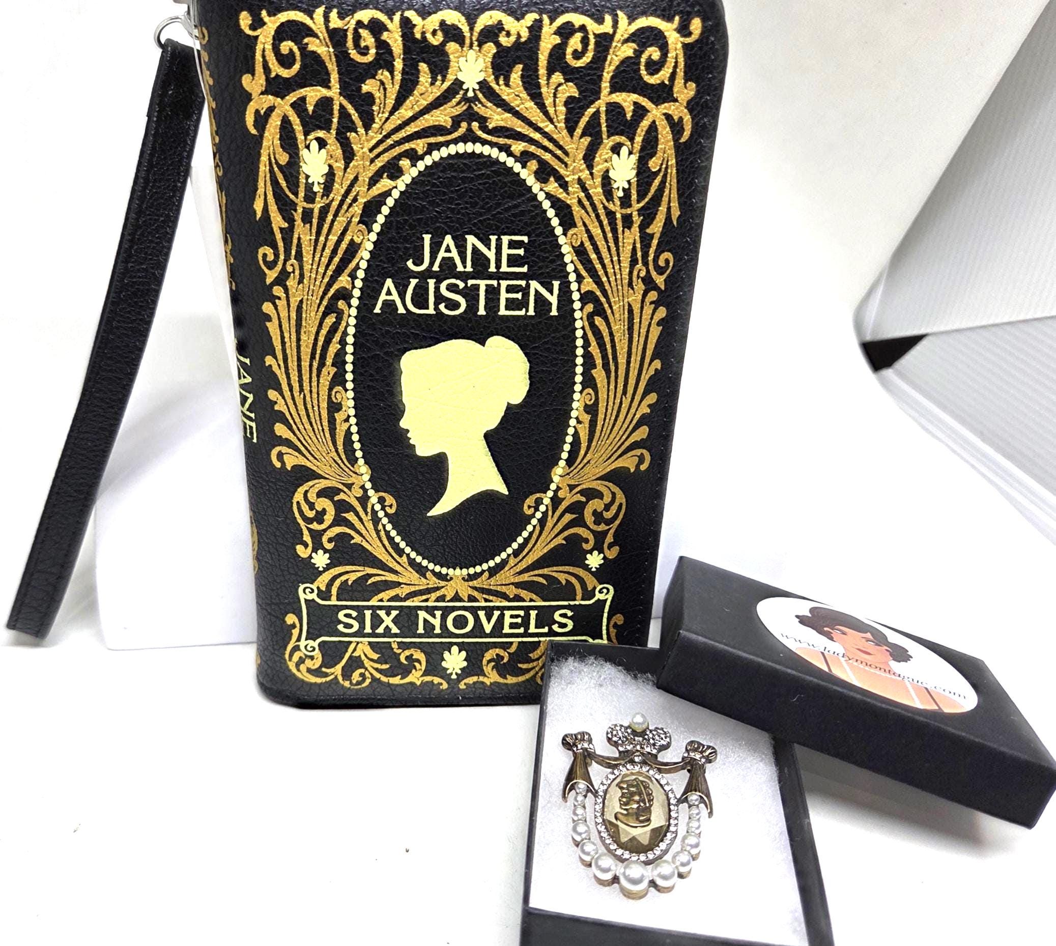 This Jane Austen book wallet is a unique and stylish accessory for women. Made of faux leather and vinyl. It includes credit card slots. Perfect for fans of literature and those looking to add a touch of novelty to their accessories. RFID Secure. Includes Pearl Cameo Pin! Great Gift!