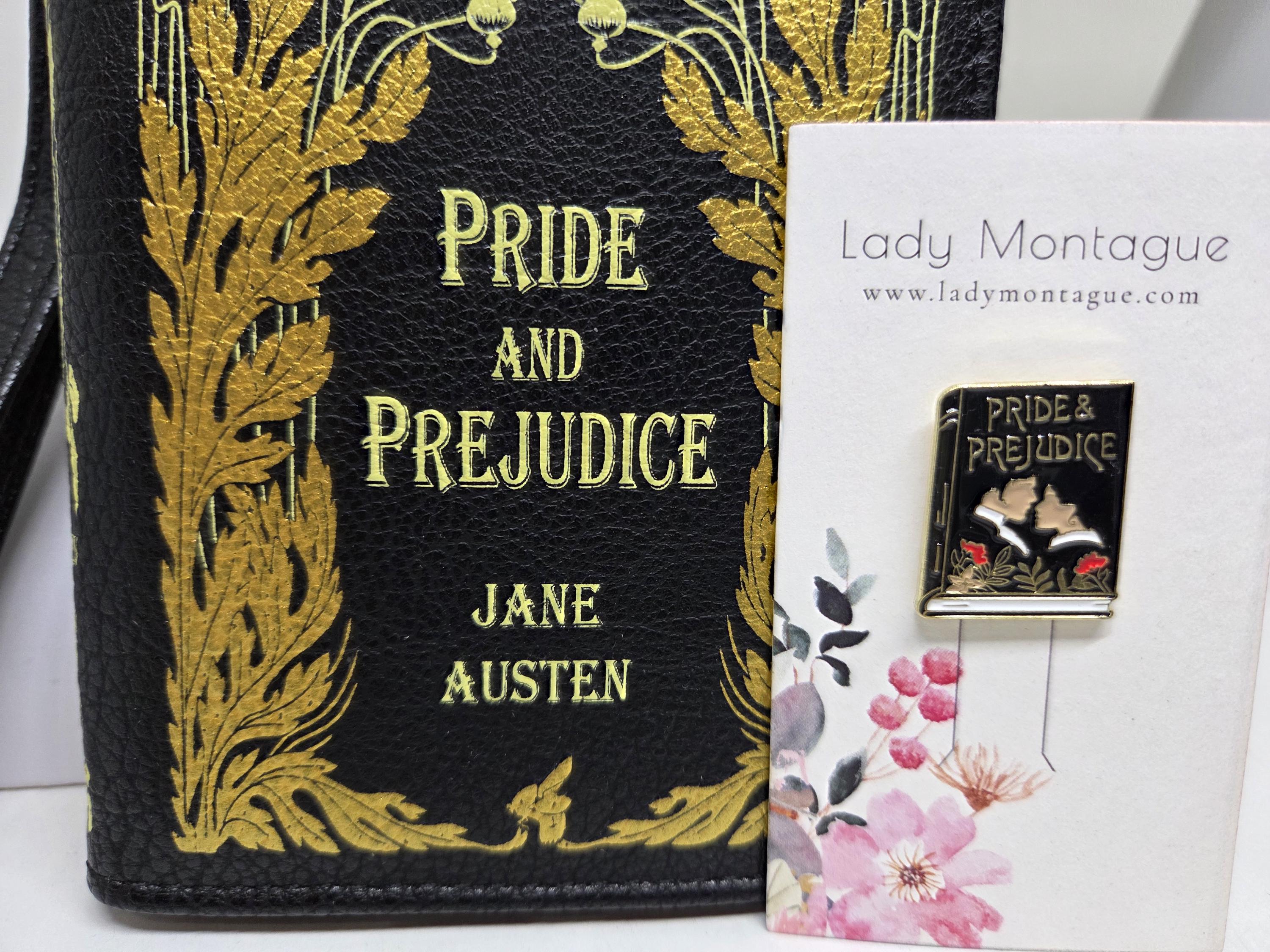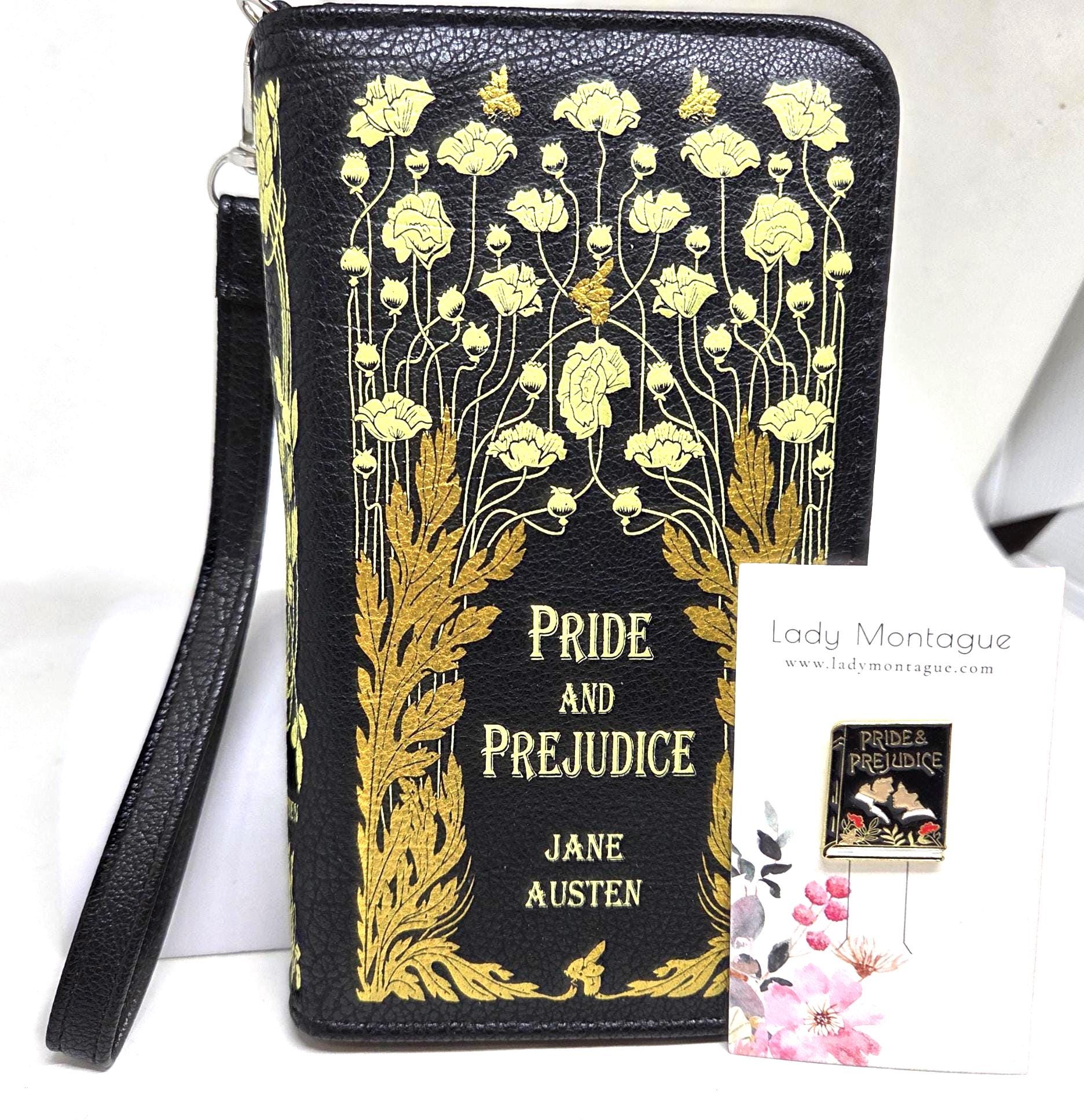 This Pride and Prejudice book wallet is a unique and stylish accessory for women. Made of faux leather and vinyl. It includes credit card slots. Perfect for fans of literature and those looking to add a touch of novelty to their accessories. RFID Secure. Includes our Pride and Prejudice enamel pin! Great Gift!